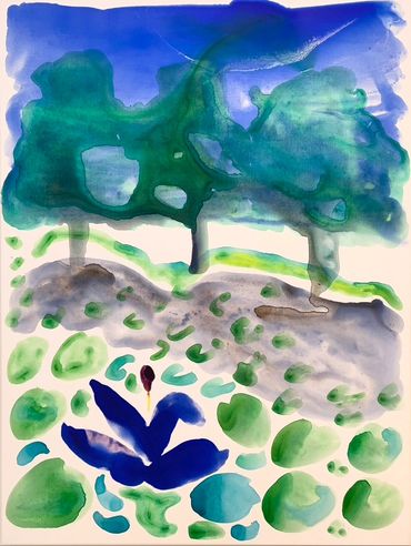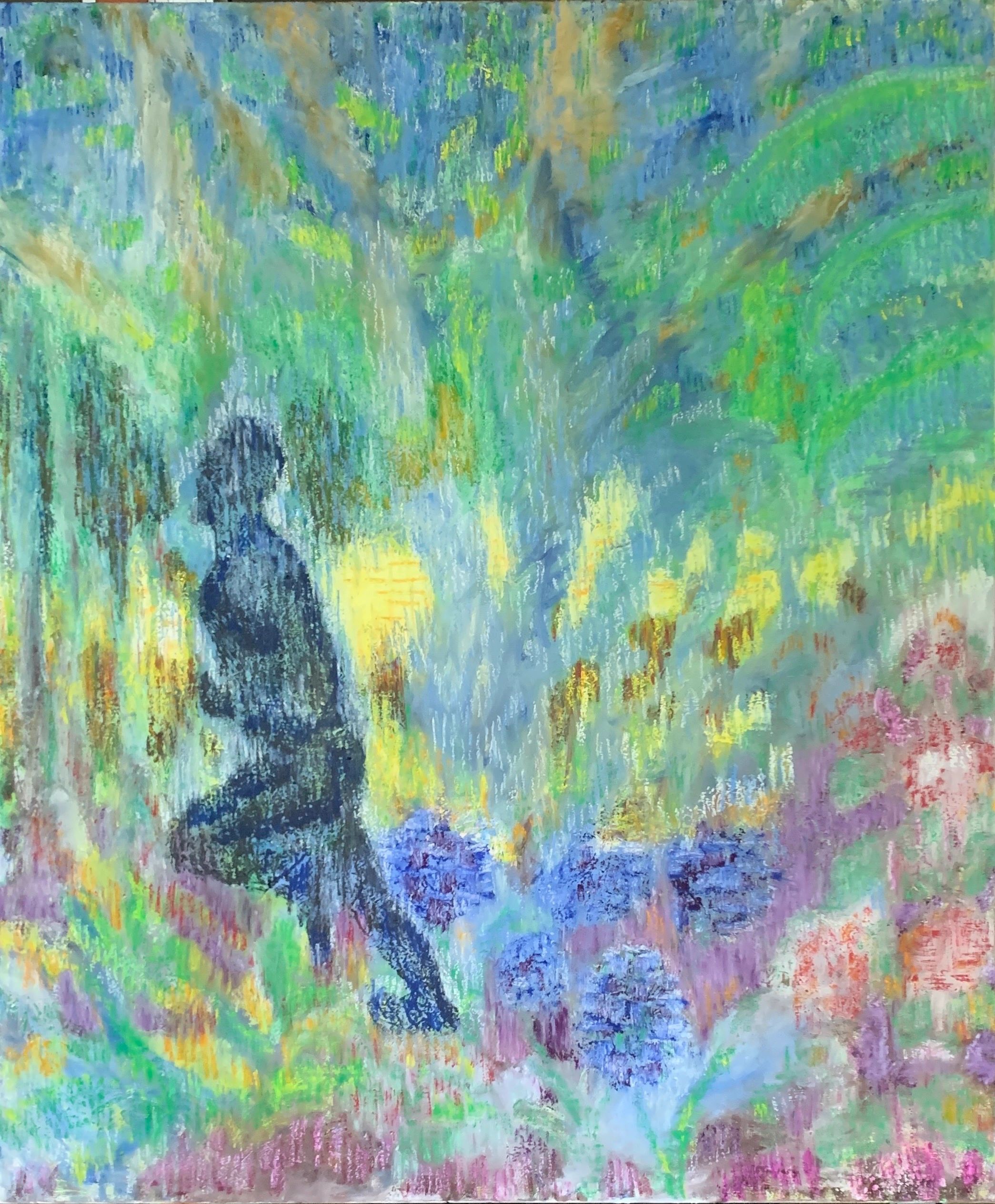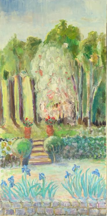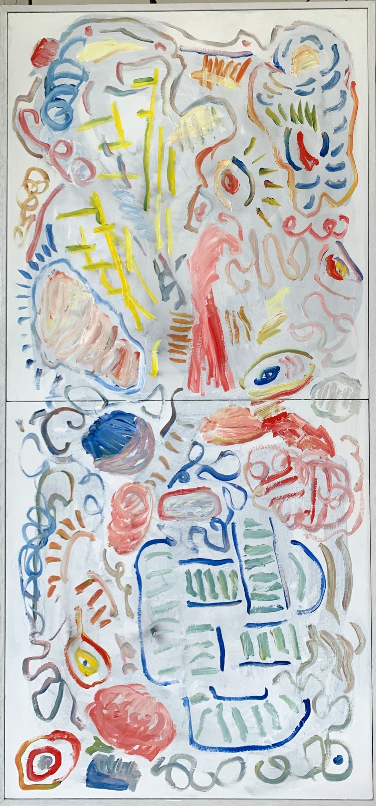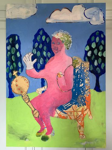 painted from drawings made by the artist on a digital platform whilst flying somewhere... extricably changed over many incarnations now with white ground that heightens the majesty form ; the waving hand the hair the sensible shoes the throne nearly obliterated the landscape disappearing the church just visible.... artist gallery